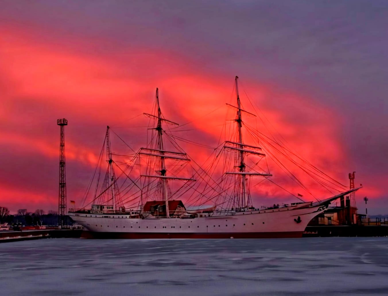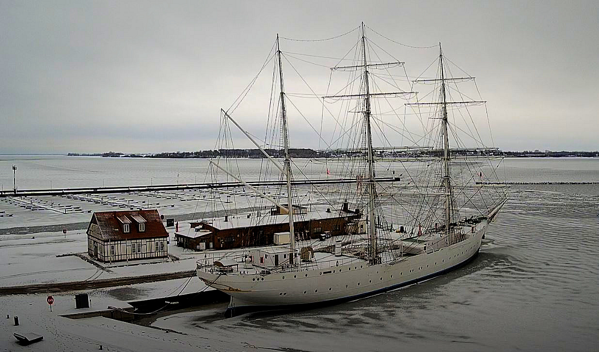 Ob vor blutrotem Abendhimmel an der Ballastkiste in Stralsund (oben, Foto Peer Schmidt-Walther) oder einsam im verschneiten und teilweise vereisten Stadthafen (Foto Webcam Oceaneum), die "Alte Dame" hat nichts an ihrer Schönheit eingebüßt.